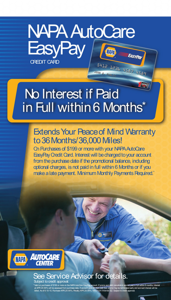 Follow link to apply for the Synchrony NAPA EzPay Card. Contact us or Synchrony for more information on rates, etc.